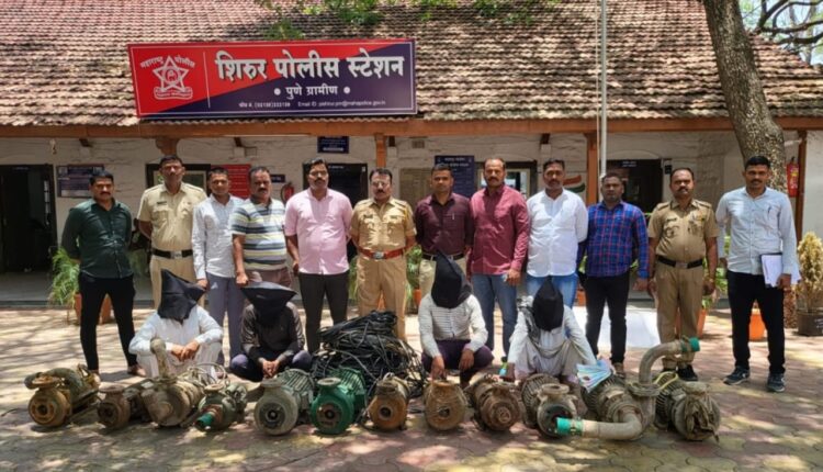 टाकळी हाजी येथील वैभव सुरेश पाराठे ( वय २३ वर्षे ), गौरव रामचंद्र पाराठे ( वय १९ वर्षे) , सुरेश मारुती पाराठे (वय ६० वर्षे ) आणि शिरूर येथील भंगार व्यवसायीक रज्जाक दाऊद शेख (वय ५९ वर्षे) यांना अटक करण्यात आली आहे. त्यांच्याकडुन चालु स्थितीतील १२ कृषी पंप व केबल असा एकुण १,३८, १०० /- रु. चा माल हस्तगत करून एकुण १० गुन्हे उघडकीस आणले आहेत. अधिक तपास शिरूर पोलीस करत आहेत.
